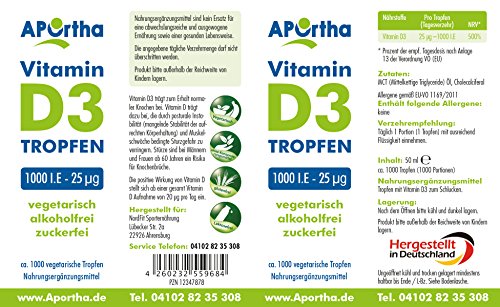 APOrtha Vitamin D3 1000 I.E – 25 µg, natürliche, vegetarische Tropfen zur Nahrungsergänzung, 50ml