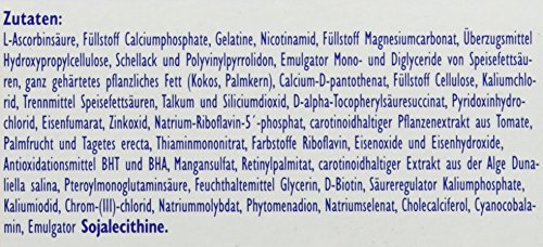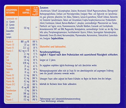 Produkteigenschaften:Bezeichnung:Nahrungsergänzungsmittel mit Mineralstoffen, Vitaminen und Carotinoiden.Verwendung/Anwendung/Verzehrempfehlung:Täglich 1 Kapsel nach dem Frühstück mit ausreichend Flüssigkeit schlucken. Die angegebene empfohlene tägliche Verzehrs menge darf nicht überschritten werden. Geeignet ab 12 Jahren. Schwangere Frauen sollten aufgrund des Vitmain A-Gehaltes vor Beginn des Verzehrs ihren Arzt befragen.Aufbewahrungsbedingungen:Vor Wärme und Sonneneinstrahlung schützen. Außerhalb der Reichweite kleiner Kinder aufbewahren.Zutaten:L-Ascorbinsäure, Füllstoff Calciumphosphate, Gelatine, Nicotinamid, Füllstoff Magnesiumcarbonat, Überzugsmittel Hydroxypropylcellulose, Schellack und Polyvinylpyrrolidon, Emulgator Mono- und Diglyceride von Speisefettsäuren, ganz gehärtetes pflanzliches Fett (Kokos, Palmkern), Calcium-D-pantothenat, Füllstoff Cellulose, Kaliumchlorid, Trennmittel Speisefettsäuren, Talkum und Siliciumdioxid, D-alpha-Tocopherylsäuresuccinat, Pyridoxinhydrochlorid, Eisenfumarat, Zinkoxid, Natrium-Riboflavin-5-phosphat, carotinoidhaltiger Pflanzenextrakt aus Tomate, Palmfrucht und Tagetes erecta, Thiaminmononitrat, Farbstoffe Riboflavin, Eisenoxide und Eisenhydroxide, Antioxidationsmittel BHT und BHA, Mangansulfat, Retinylpalmitat, carotinoidhaltiger Extrakt aus der Alge Dunaliella salina, Pteroylmonoglutaminsäure, Feuchthaltemittel Glycerin, D-Biotin, Säureregulator Kaliumphosphate, Kaliumiodid, Chrom-(III)chlorid, Natriummolybdat, Phytomenadion, Natriumselenat, Cholecalciferol, Cyanocobalamin, Emulgator SOJALECITHINE.Allergene:sojalecithinNettofüllmenge:86 g (120 Kapseln)Ursprungsland des Lebensmittels:DeutschlandSTADAvita GmbHKönigsteiner Straße 261350 Bad HomburgWeitere verpfli