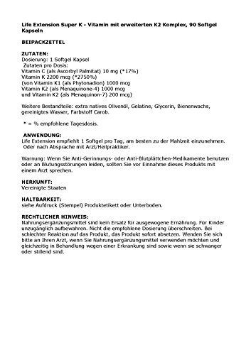 Es gibt drei Formen von Vitamin K, die der menschliche Körper nutzen kann, um seine arterielle Gesundheit und Knochen zu unterstützen (1-8). Das Super K von Life Extension mit dem fortgeschrittenen K2-Komplex bietet das dynamische Trio der Vitamin-K-Formen in einem einzigen Softgel, darunter Vitamin K1, Vitamin K2 (MK-4) und Vitamin K2 (MK-7). Vitamin K1 ist die Form von Vitamin K, die in grünem Gemüse zu finden ist. K1 ist eng an pflanzlichen Fasern gebunden, so dass nur ein Bruchteil in den Blutkreislauf aufgenommen wird. Die Ergänzung sorgt für einen reichlichen K1-Blutspiegel. Vitamin K2 ist in der Regel in Fleisch, Milchprodukten und Eigelb vorhanden. Wenn Sie diese Lebensmittel aus gesundheitlichen Gründen vermeiden möchten, ist die Einnahme einer K2-Ergänzung notwendig. MK-4 ist die am schnellsten absorbierte Form von K2, und MK-7 verfügt über eine sehr lange Halbwertszeit im Körper, so dass beide die perfekte Ergänzung in einem jeden Vitamin K-Regiment bilden.