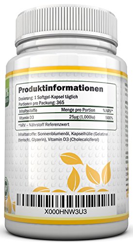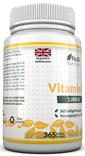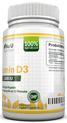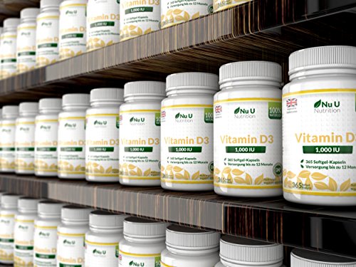 Vitamin D3 1000IU von Nu U, 365 Softgel-Kapseln (Jahresversorgung) – 100% GELD-ZURÜCK-GARANTIE – Vitamin D stärkt die Knochen, Zähne und das Immunsystem – keine künstlichen Zusatzstoffe – Hohe Stärke 1000IU