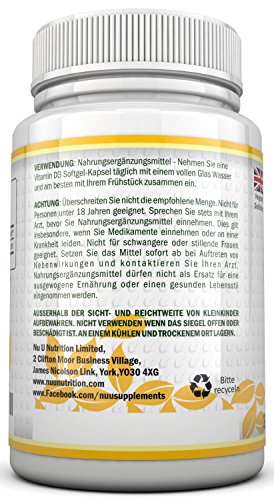 Warum sollten Sie Vitamin D verwenden? Auch bekannt als das Sonnenschein-Vitamin, Vitamin D3 wird produziert, wenn die Haut ultravioletten Strahlen (UVB) ausgesetzt ist. Leider bekommen viele von uns in Deutschland nicht genügend Sonnenlicht oder können aufgrund Ihres Alters das Vitamin D nicht mehr in seine aktive Form umwandeln. Dadurch leiden Millionen von Menschen an Vitamin D Mangel. Vitamin D3 hilft bei: Bildung eines gesunden Calciumgehalts im Blut Erhaltung von gesunden Knochen und Haut Erhaltung normaler Muskelfunktion Pflege von gesunden Zähnen Aufrechterhaltung eines gesunden Immunsystems Warum sollten Sie Vitamin D3 Softgel-Kapseln von Nu U kaufen? *100% GELD-ZURÜCK-GARANTIE- Wir werden keine weiteren Fragen stellen: Fühlen Sie sich besser oder fordern Sie Ihr Geld zurück. *DOPPELT SO STARKE FORMEL – Unsere 1000IU Vitamin D3 Softgel-Kapseln sind doppelt so stark wie Produkte unserer Wettbewerber. *VERSORGUNG FÜR 12 MONATE – Hervorragendes Preis-Leistungs-Verhältnis. Mit einer Bestellung decken Sie Ihren gesamten Vitamin D3 Bedarf für ganze 12 Monate ab. *PRODUZIERT IN GROSSBRITANNIEN – Nach höchsten Qualitätsstandards in der Welt produziert.