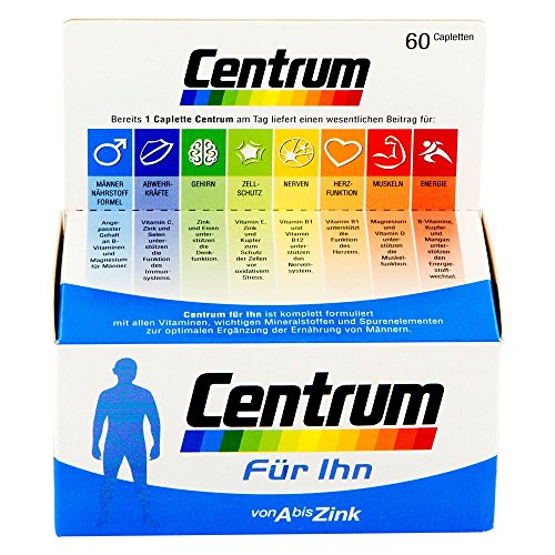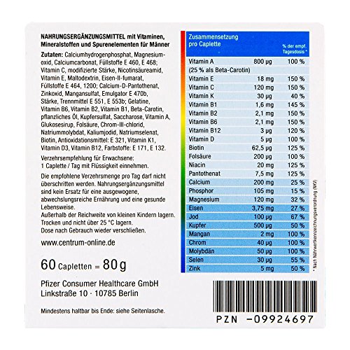Mit speziell abgestimmter Nährstoffformel für Männer.Produkteigenschaften:Bezeichnung:NahrungsergänzungsmittelVerwendung/Anwendung/Verzehrempfehlung:1 Capletten / Tag mit Flüssigkeit einnehmen.Nährwertdeklaration:Zusammensetzungpro Tablette% der empf. Tagesdosis*Vitamin A (25% als Beta-Carotin) 800 μg100%Vitamin E 18 mg150%Vitamin C 120 mg150%Vitamin K 30 μg40%Vitamin B1 1,6 mg145%Vitamin B2 2,1 mg150%Vitamin B6 2,1 mg150%Vitamin B12 3 μg120%Vitamin D 5 μg100%Biotin 62,5 μg125%Folsäure 200 μg100%Niacin 20 mg125%Pantothenat 7,5 mg125%Calcium 200 mg25%Phosphor 105 mg15%Magnesium 120 mg32%Eisen 3,75 mg27%Jod 100 μg67%Kupfer 500 μg50%Mangan 2 mg100%Chrom 40 μg100%Molybdän 50 μg100%Selen 30 μg55%Zink 5 mg50%* = Nach Nährwertkennzeichnungsverordnung (NKV)Zutaten:Calciumhydrogenphosphat, Magnesiumoxid, Calciumcarbonat, Füllstoffe E 460, E 468; Vitamin C, modifizierte Stärke, Nicotinsäureamid, Vitamin E, Maltodextrin, Eisen-II-fumarat, Füllstoffe E 464, 1200; Calcium-D-Pantothenat, Zinkoxid, Mangansulfat, Emulgator E 470b, Stärke, Trennmittel E 551, E 553b; Gelatine, Vitamin B6, Vitamin B2, Vitamin B1, Beta-Carotin, pflanzliches Öl, Kupfersulfat, Saccharose, Vitamin A, Glukosesirup, Folsäure, Chrom-III-chlorid, Natriummolybdat, Kaliumjodid, Natriumselenat, Biotin, Vitamin K1, Vitamin D3, Vitamin B12, Farbstoffe: E 171, E 132.Nettofüllmenge:60 Capletten = 80 gAufbewahrungsbedingungen:Nicht über 25 °C lagern. Dose nach Gebrauch wieder verschließen.Ursprungsland des Lebensmittels:DeutschlandPfizer Consumer Healthcare GmbH