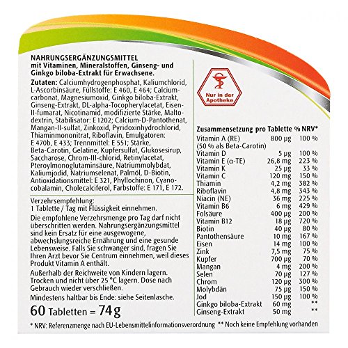 Calciumhydrogenphosphat, Kaliumchlorid, L-Ascorbinsäure, Füllstoffe: E 460, E 464; Calciumcarbonat, Magnesiumoxid, Ginkgo biloba-Extrakt, Ginseng-Extrakt, DL-alpha-Tocopherylacetat, Eisen-II-fumarat, Nicotinamid, modifizierte Stärke, Maltodextrin, Stabilisator: E 1202; Calcium-D-Pantothenat, Mangan-II-sulfat, Zinkoxid, Pyridoxinhydrochlorid, Thiaminmononitrat, Riboflavin, Emulgatoren: E 470b, E 433; Trennmittel: E 551; Stärke, Beta-Carotin, Gelatine, Kupfersulfat, Glukosesirup, Saccharose, Chrom-III-chlorid, Retinylacetat, Pteroylmonog