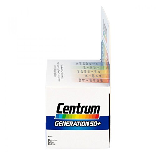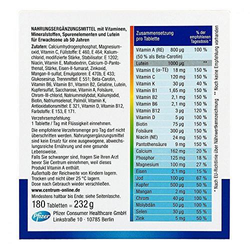 Nahrungsergänzung für Erwachsene ab dem 50. Lebensjahr.Produkteigenschaften:Verkehrsbezeichnung:CENTRUM Gen.50+ A-Zink+FloraGlo Lutein CapletteVerwendung/Anwendung/Verzehrempfehlung:1 Caplette / Tag mit Flüssigkeit einnehmen. Die empfohlene Verzehrsmenge pro Tag darf nicht überschritten werden.Aufbewahrungsbedingungen:Nicht über 25 C lagernDose nach Gebrauch wieder verschließenNährwertdeklaration:Zusammensetzungpro Tablette% der empf. Tagesdosis *Vitamin A (50% als Beta-Carotin) 800 μg100%Lutein 1000 μg** Vitamin E 18 mg150%Vitamin C 120 mg150%Vitamin K 30 μg40%Vitamin B1 1,65 mg150%Vitamin B2 2,1 mg150%Vitamin B6 2,1 mg150%Vitamin B12 3 μg120%Vitamin D 5 μg100%Biotin 75 μg150%Folsäure 300 μg150%Niacin 24 mg150%Pantothenat 9 mg150%Calcium 162 mg20%Phosphor 125 mg18%Magnesium 100 mg27%Eisen 2,1 mg15%Jod 100 μg67%Kupfer 500 μg50%Mangan 2 mg100%Chrom 40 μg100%Molybdän 50 μg100%Selen 30 μg55%Zink 5 mg50%* = Nach Nährwertkennzeichnungsverordnung (NKV)** = Keine Empfehlung vorhandenZutaten:Calciumhydrogenphosphat, Magnesiumoxid, Vitamin C, Füllstoffe E 460, E 464; Kaliumchlorid, Gelatine, Stabilisator E 1202, Nicotinsäureamid, Stärke, Vitamin E, Saccharose, Calcium-D-Pantothenat, Eisen-IIfumarat, Zinkoxid, Trennmittel E 551, Mangan-II-sulfat, Beta-Carotin, Vitamin B6, Vitamin B1, Vitamin B2, Lutein, Kupfersulfat, Emulgatoren E 570, E 470, E 433; Vitamin A, Folsäure, modifizierte Stärke, Lactose, Chrom- III-chlorid, Natriummolybdat, Kaliumjodid, Biotin, Natriumselenat, Vitamin K1, pflanzliches Öl gehärtet, Vitamin D3, Vitamin B12, Farbstoffe E 153, E 171.Allergene:LactoseNettofüllmenge: