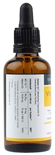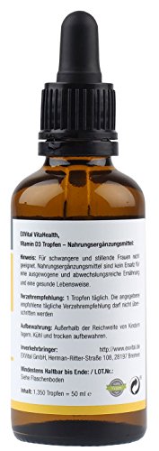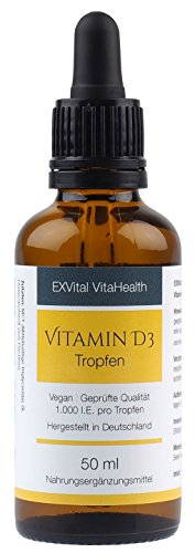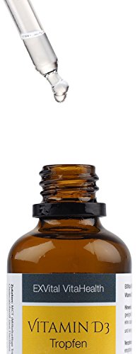 EXVital Vitamin D3 Tropfen sind zu 100% vegan und somit bestens geeignet für Veganer und Vegetarier. Für unser Produkt entnehmen wir Vitamin D aus Flechten. In einem besonderen Verfahren wird das natürliche Vitamin D in MCT Öl gelöst. Das sorgt für eine bessere Aufnahme des Vitamins durch den menschlichen Körper und steigert somit die Bioverfügbarkeit. Bei EXVital Vitamin D3 Tropfen handelt es sich um ein Qualitätsprodukt, was nach deutschen Standards in Deutschland hergestellt wird. Wir legen großen Wert darauf, dass für die Herstellung nur qualitativ gute Rohstoffe verwendet werden. Einige Eigenschaften von Vitamin D:- Vitamin D trägt zu einer normalen Funktion des Immunsystems bei. – Vitamin D trägt zur Erhaltung einer normalen Muskelfunktion bei. – Vitamin D trägt zur Erhaltung normaler Knochen und Zähne bei. – Vitamin D trägt zu einer normalen Aufnahme/Verwertung von Calcium und Phosphor bei. – Vitamin D trägt zu einem normalen Calciumspiegel im Blut bei. Gebrauchsanweisung: Die Verzehrempfehlung von 1 Tropfen täglich sollte nicht überschritten werden.