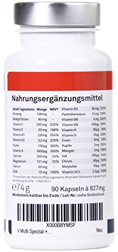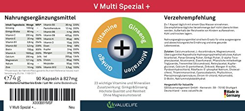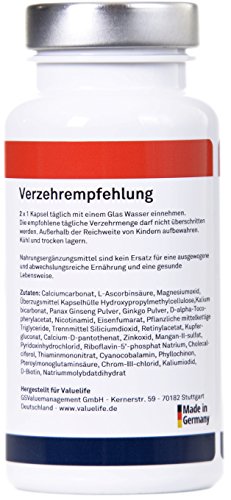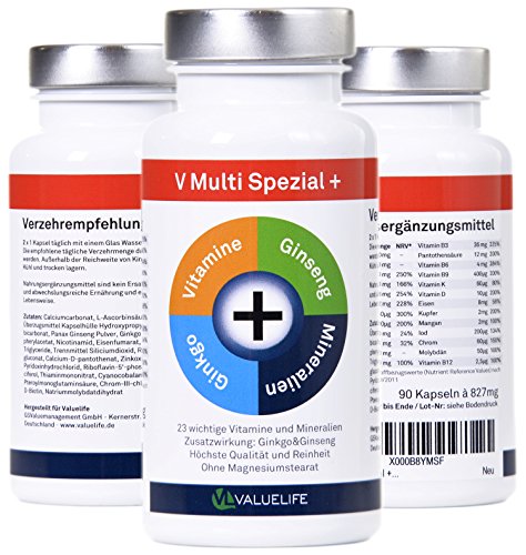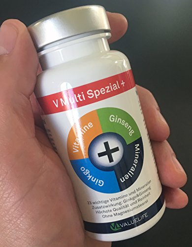 Valuelife präsentiert: V Multi Spezial + Die umfangreiche Multivitamin – Multimineralmischung mit Ginkgo Biloba und Ginseng als Extrazusatz! 23 Vitamine – Mineralien & Spurenelemente schützen und helfen. Ginkgo und Ginseng entfalten darüber hinaus weitere Hilfen für Geist, Körper und Immunsystem. Entwickelt und hergestellt zu 100% in Deutschland nach höchsten Qualitätsstandards! V- Multi Spezial harmoniert perfekt mit unserem OPC Antioxidant Komplex! Sie finden es unter der Produktkennung: B015MSAQV2 Nahrungsergänzungsmittel mit Vitaminen&Mineralstoffen&Ginkgo&Ginseng Zutaten je Kapsel: Ginseng 50mg;Ginkgo Biloba 30mg;VitaminC 100mg(125*);VitaminE 10mg(83*);VitaminB1 1,4mg(127*); VitaminB2 1,6mg(113*);VitaminB3 18mg(113*); Panthotensäure 6mg(100*);VitaminB6 2mg(144*);VitaminB9 200μg(100*);VitaminK1 30μg(40*);VitaminD3 5μg(100*);Biotin 150μg(300*);VitaminA 800μg(100*);Calcium 100mg(12*);Magnesium 60,6mg(16*);Kalium 30mg(2*);Zink 5mg(50*);Eisen 4mg(29*);Kupfer 1mg(100*);Mangan 1mg(50*);Jod 100μg(67*);Chrom 30μg(75*);Molybdän 30μg(50*);Vitamin B12 2,5μg(50*). *empfohlene Mindestzufuhr pro Tag nach NKV. Bitte beachten Sie: Dieses Produkt verlässt unsere Herstellung komplett in Folie eingeschweißt. Dieses Hygienesiegel muss vor dem ersten Öffnen zunächst entfernt werden. Achten Sie bitte auf die Unversehrtheit der Folie, wenn Sie das Produkt erhalten.
