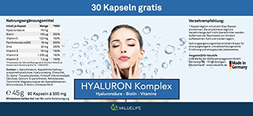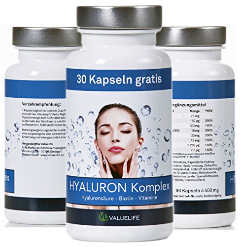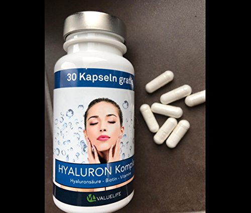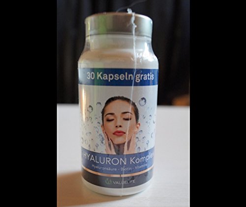 Valuelife Hyaluron Komplex Hyaluronsäure in Kombination mit Biotin, Panthotensäure, Vitamin C, Vitamin E, Vitamin A, Vitamin D und Zink. Profitieren Sie jetzt von der vereinten Kraft aller Inhaltsstoffe.90 Kapseln für Haut, Haare, Gelenke und Anti-Aging. Jetzt endlich durch Valuelife im Angebot! Inhalt gesamt: 90 Kapseln! Inhalt je Kapsel siehe Etikett als Produktbild 4 Kapseln bestehen aus Cellulose und sind daher auch für Veganer bestens geeignet! – Vegetarisch + Vegan! – Made in Germany! – Hochwertigste Inhaltsstoffe! – Beste Qualität! Onlinespezial: 30 Kapseln gratis inklusive! 90 anstelle 60 Kapseln. Bitte beachten Sie: Dieses Produkt verlässt unsere Herstellung komplett in Folie eingeschweißt. Dieses Hygienesiegel muss vor dem ersten Öffnen zunächst entfernt werden. Achten Sie bei Erhalt bitte auf die Unversehrtheit dieser Folie.