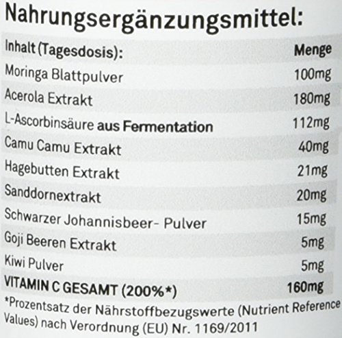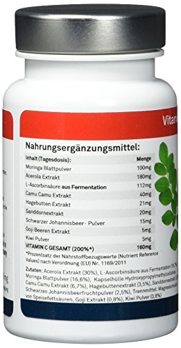Vitamin C Komplex: Vitamin C aus 8 natürlichen Quellen! 160 mg Vitamin C Tagesdosis. Zusatzwirkung durch Moringa Oleifera. 60 Kapseln à 599mg (1*35,9g)