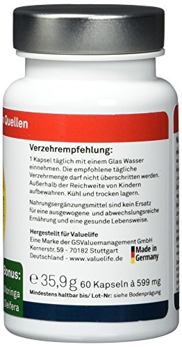Einzigartiger Vitamin C Komplex aus 8 natürlichen Quellen mit Zusatz Moringa Oleifera! Reine Natur – keine Chemie: Acerola Extrakt, L-Ascorbinsäure aus Fermentation, Camu Camu Extrakt, Hagebutten Extrakt, Sanddorn Extrakt, Schwarzer Johannesbeer, Goji Beeren Extrakt, Kiwi Pulver! Insgesamt 160 mg natürliches Vitamin C pro Kapsel! Bonus: Moringa Oleifera! Die Blätter des Moringa Baumes gelten als wahre Kraftpakete voller Vitamine, Mineralien. Sie sind reich an Vitamin B1, B2 und B3, Vitamin C, D, K und E, sowie an Magnesium, Calcium, Kalium, Selen, Mangan! Frei von Gentechnik! Frei von künstlichen Zusatzstoffen! Vegetarisch und Vegan! Nur Valuelife bietet diese starke Kombination aus rein natürlichen Quellen an. Entwickelt und hergestellt in Deutschland nach höchsten Qualitätsmaßstäben! Geben Sie sich nicht mit weniger zufrieden. 60 Kapseln à 599mg. Zur täglichen Einnahme oder bei Bedarf! Vitamin C trägt bei: – zu einer normalen Kollagen-Bildung – zu einer normalen Funktion der Blutgefässe – zu einem normalen Energiestoffwechsel – zu einer normalen Funktion des Nervensystems – zu einer normalen Funktion des Immunsystems – zur Regeneration der reduzierten Form von Vitamin E – zu einer normalen Aufnahme / Verwertung von Calcium und Phosphor – zu einer normalen psychischen Funktion – zur Verringerung von Müdigkeit und Ermüdung – zum Schutz der Zellen vor oxydativem Stress – zur Erhöhung der Eisenaufnahme Vitamin C unterstützt Ihre: – Knochen – Knorpel – Zahnfleisch und Zähne – Haut